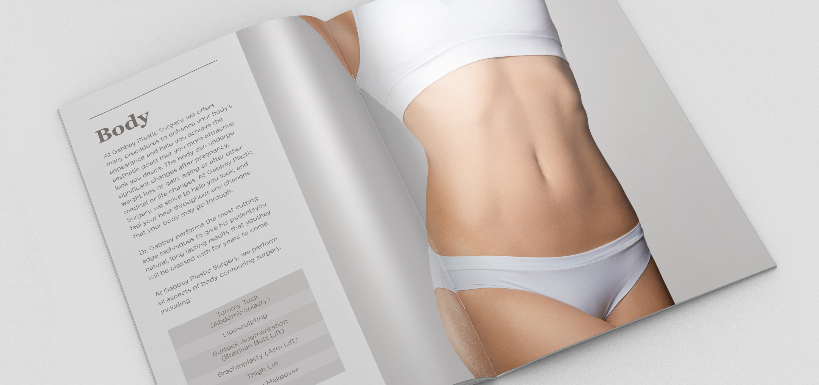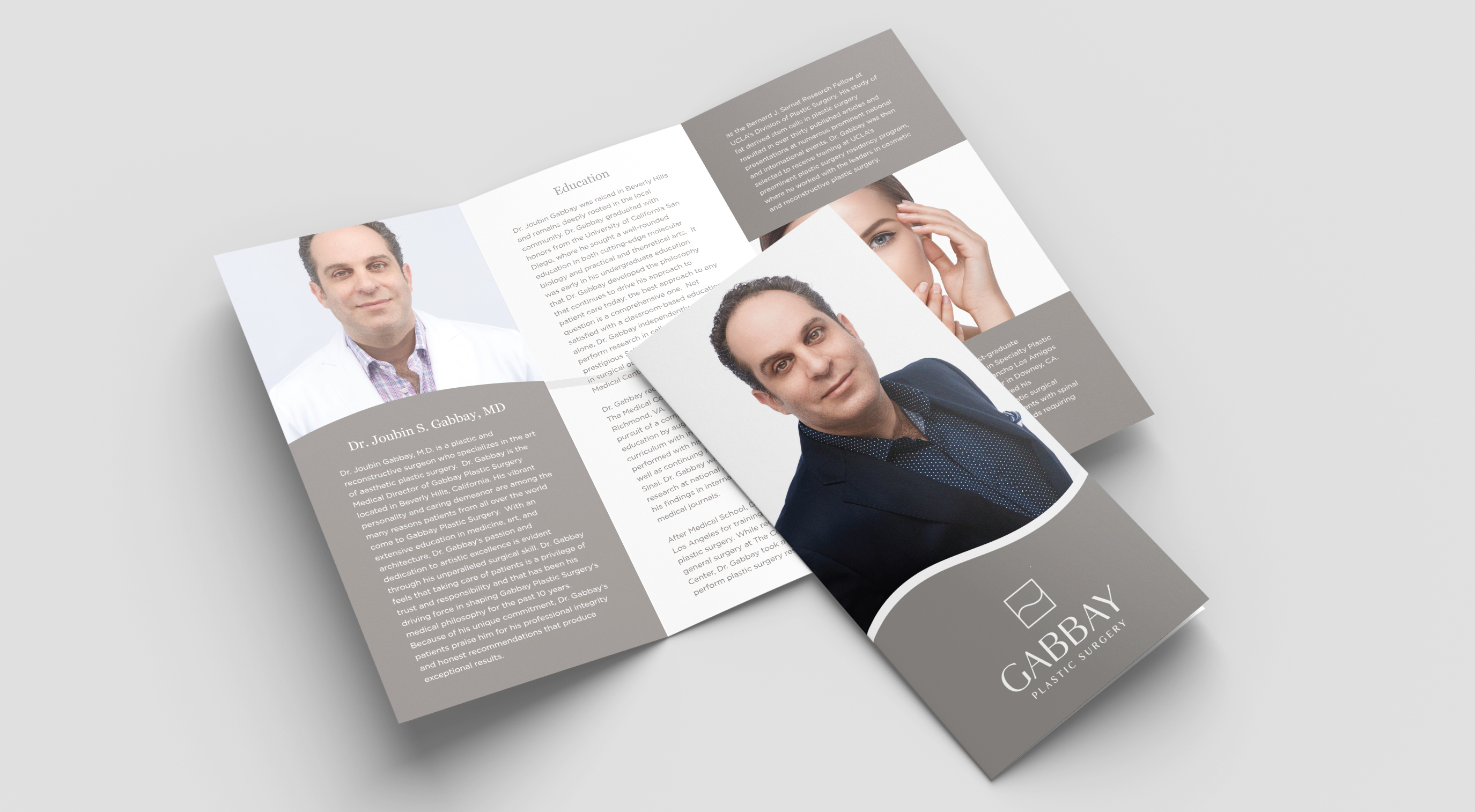 Gabbay Plastic Surgery approached East + Sunset needing updated marketing materials. They had just undergone a rebranding and needed their collateral to match their polished new look. They wanted a 4 piece suite that they could tuck into an existing folder: About Dr. Gabbay, Surgical Services, Non-Surgical Services, and Non-Surgical Services Packages. After discussing the options, we decided to create a brochure for About Dr. Gabbay, two different sized pamphlets for Surgical and Non-Surgical Services and a postcard they could tuck into the Non-Surgical Pamphlet listing the Non-Surgical Packages.