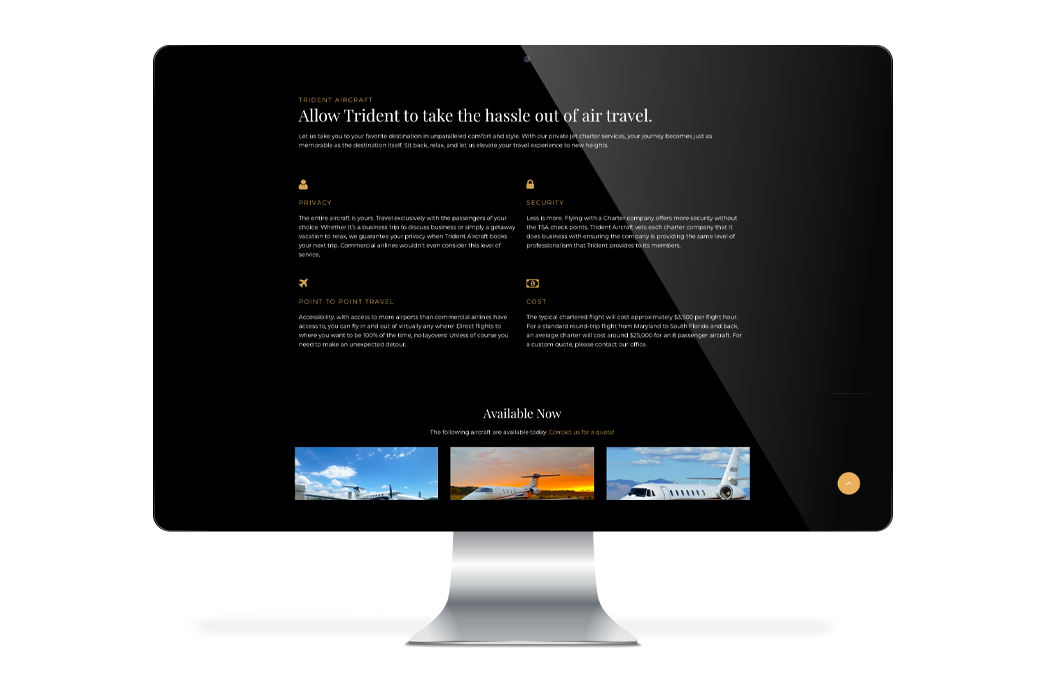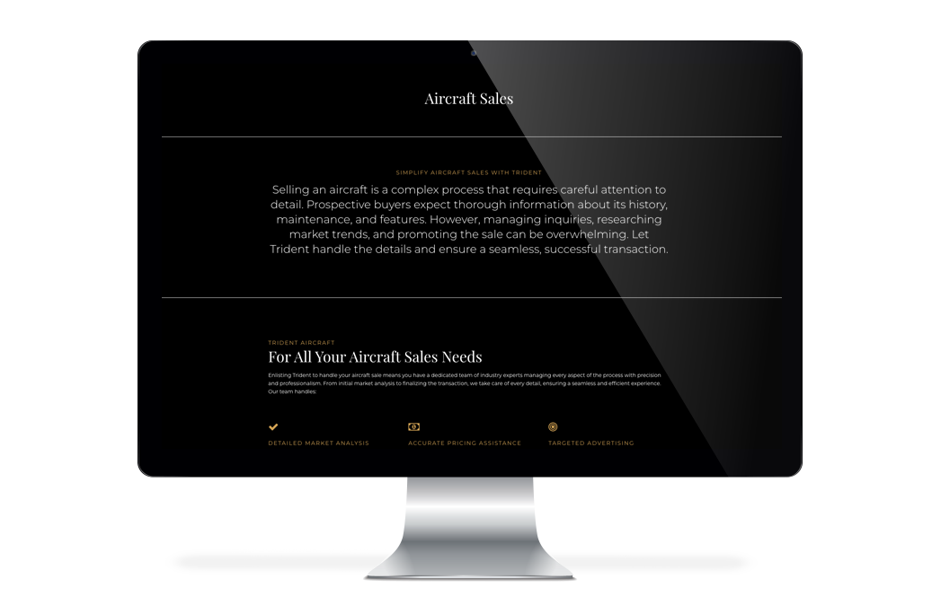 Trident Aircraft came to East + Sunset with a clear vision: to elevate their online presence to better reflect the precision, performance, and trust their name represents. As a company rooted in excellence within the aviation industry, Trident Aircraft recognized that their existing website no longer matched the caliber of their work or the audience they serve. They approached East + Sunset to reimagine their brand website with a modern, streamlined design—one that clearly communicates their expertise, enhances usability, and positions them confidently for continued growth.